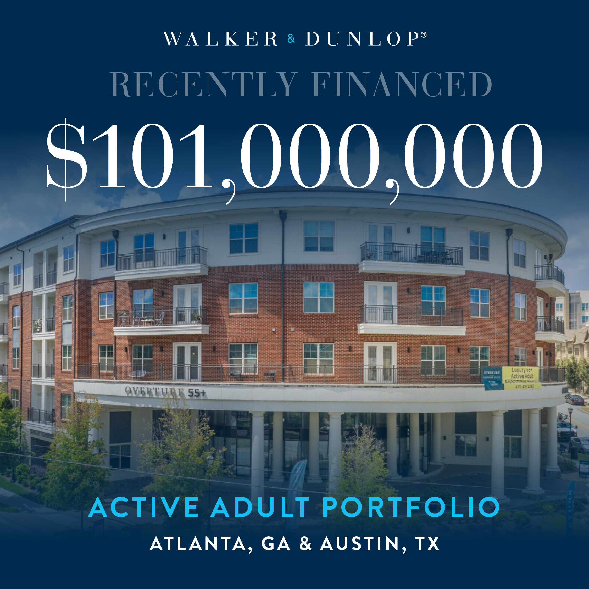 Walker and Dunlop is pleased to announce the $101 million refinancing of an institutionally owned sunbelt Active Adult Portfolio. The portfolio consists of 549 units across three assets in the Atlanta and Austin metros.