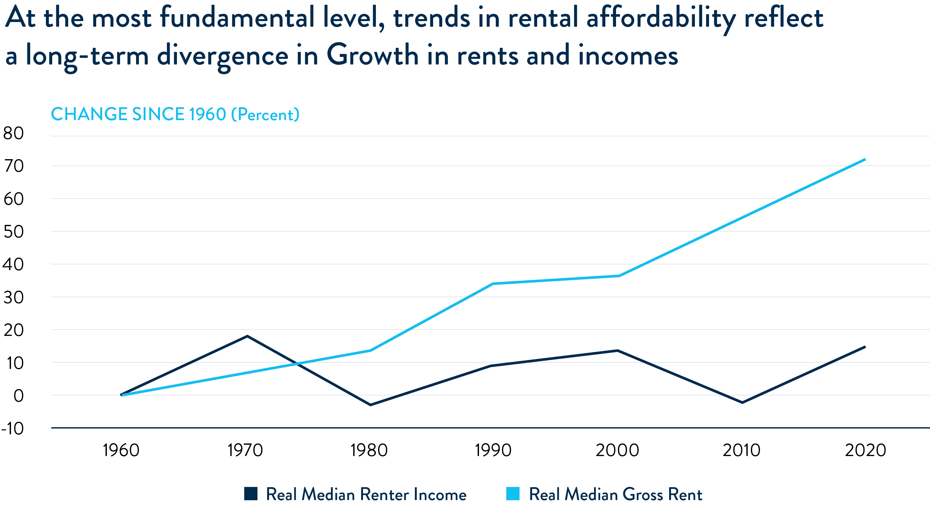 As growth in rents and incomes have diverged, and rental affordability has decreased, the band of household incomes that have become housing cost-burdened (paying more than 30 percent of their income on housing) has expanded. It is no longer only the poorest households that cannot afford to live in our communities.
